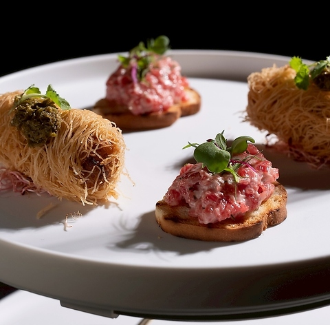コースで季節の食材を使った料理や厳選和牛の様々な部位をお楽しみいただけます。ワインとのペアリングも◎