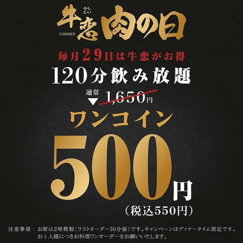 肉の日を祝して、毎月スペシャルキャンペーンを開催!120分飲み放題が通常1,650円のところ、550円でご利用いただけます。※お席は2時間制(ラストオーダー30分前)※お一人様につき、お料理のワンオーダーをお願いしております。