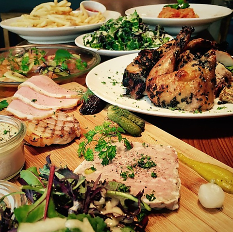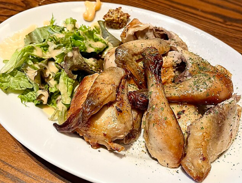 店内でじっくりと丁寧に仕上げる「ローストチキン」。シェフこだわりのビストロ料理の数々。