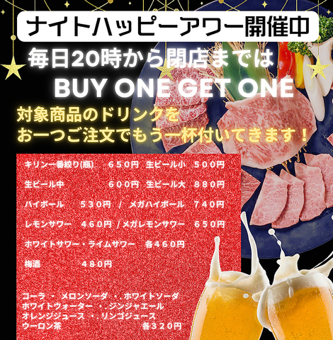 期間限定!20時からご来店で生ビール・ハイボール・レモンサワーが一杯分のお値段で2杯ご注文頂けます!