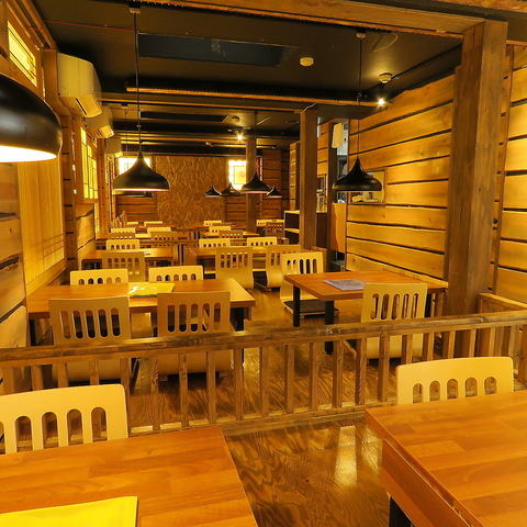 外観にある黄色い枠組はスタッフの手作りで、内装も全てスタッフの手作りとなっています!入店前から楽しい雰囲気に飲み込まれます!