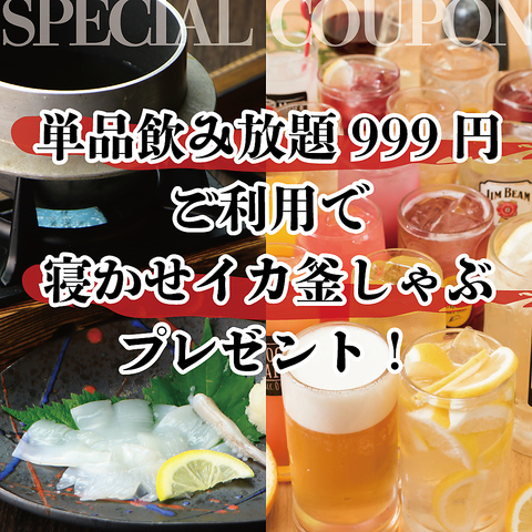 【日~木限定】当日OK◆超お得な120分飲み放題1500⇒999円+寝かせイカ釜しゃぶプレゼント!席のみもお得