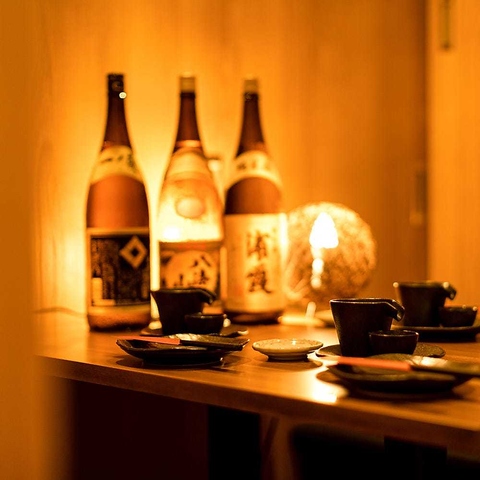 木の温もりと和の趣が感じられる落ち着いた空間です。やわらかな照明が雰囲気を引き立て、黒のベンチシートが快適なひとときを演出。テーブルには日本酒が並び、上質な料理とともに大人の会話を楽しむのに最適。接待や記念日、静かに過ごしたい夜にふさわしいプライベートな雰囲気が魅力です