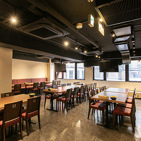 【総席数134席】の広々とした店内は、80名様から最大120名様まで貸切可能です!20名様以上の団体席も柔軟に対応でき、3時間のゆったり宴会も大歓迎◎プロジェクター完備の一体感ある空間で、会社宴会や結婚式二次会など思い出に残る夜を演出します♪