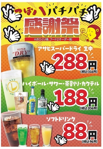 つぼ八と言えば北海道!皆さん、知ってました?そんな昭和な居酒屋で頑張ってますが当店はアメ村ということもありザ・大阪を堪能してほしいので独自メニューを揃えてるで♪酒場として頑張ってます!つぼ八酒場はココだけ!!一度、来てえ~や!!