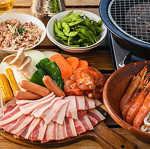 ビュッフェスタイルでBBQを楽しむ食べ飲み放題プラン。歓送迎会などご宴会にもご利用ください。ビニールカーテンと暖房完備となりますので安心してお過ごしください。※金曜、土曜、祝前日のディナータイム17時以降スタートはプラス550円(税込)となります