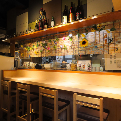 新橋駅チカで一人飲みやデートにも最適。木目調の温かみあるカウンター席でゆったり晩酌を。