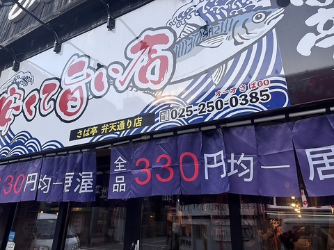 全品330円均一の安くてうまい店、【さば亭】、弁天通りの新しいシンボル【さば亭】!お客様のスマートフォンからご注文いただけるシステムの「モバイルオーダーシステム」を導入しており、お客様の待ち時間を大幅に減らすことができます♪大衆酒場にふさわしい暖簾を目印にお越しください。