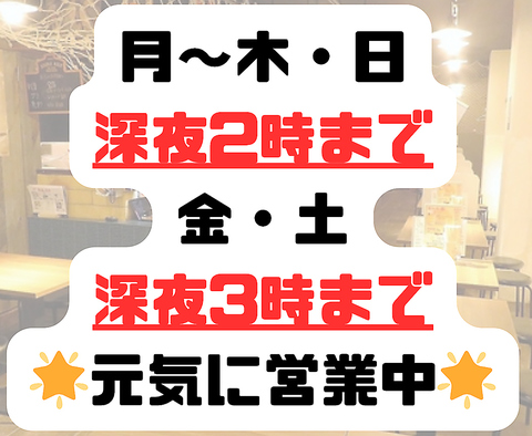 深夜もやっている居酒屋です!1次会はもちろん、2次会や3次会でもご利用頂けます♪駅からのアクセスも抜群で、駅前集合駅前解散可能!終電ぎりぎりまでお楽しみいただけます!