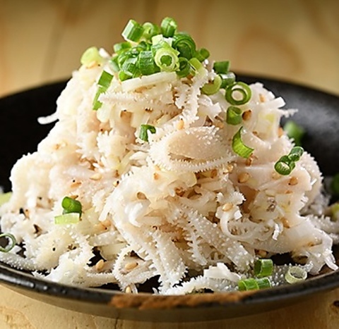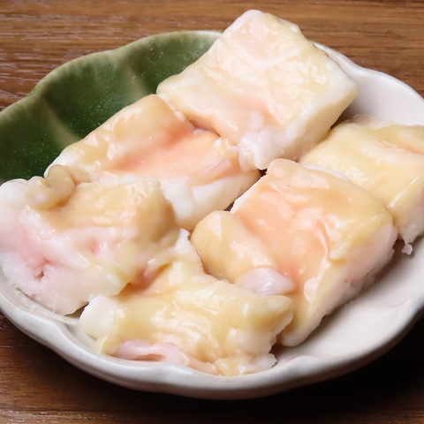 ホルモンで感動を届けたい』との想いを、お通しに込めて提供!店主自ら毎朝芝浦で仕入れるホルモンは、一度も冷凍されず新鮮な生の旨味たっぷり!センマイや薄切りにしたハツは、刺しでも提供します。わさび醤油でどうぞ。