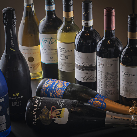 ワインセレクションは、世界各国から厳選したこだわりのラインアップを取り揃えています。赤、白、ロゼ、スパークリングなど、多彩な種類のワインは、豊かな香りと深い味わいを楽しむことができます。料理とのペアリングなど提案いたしますので、ワイン初心者の方でも大歓迎です!
