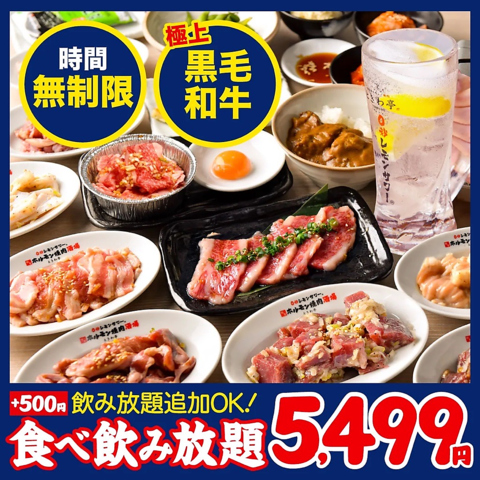 「極上 黒毛和牛」が食べ放題で味わえる贅沢プラン!ハイクオリティなワンランク上の食べ放題を”時間無制限”で思う存分お楽しみいただけます。こちらのコースはソフトドリンク飲み放題が無料で付きます★さらに+550円で「0秒レモンサワー飲み放題」&アルコール飲み放題も追加OK!!ビール/ハイボール/酎ハイ/梅酒/カクテル/チャミスルなど豪華ラインナップ!※金・土・祝前日は2時間制