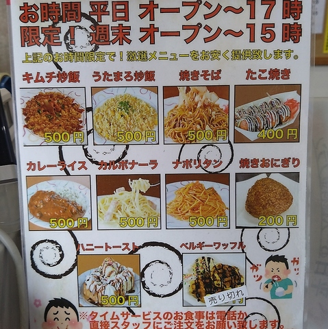 月~木: 11:00~翌2:00 (料理L.O. 翌1:00) 金: 11:00~翌4:00 (料理L.O. 翌1:00) 土: 10:00~翌4:00 (料理L.O. 翌1:00) 日: 10:00~翌2:00 (料理L.O. 翌1:00) 祝日: 10:00~翌2:00 祝前日: 11:00~翌4:00 お得なクーポンアプリ導入しました!詳しくは店舗にてご案内いたします。 |