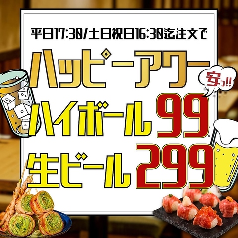 ハッピーアワー常時開催!!17時半までの入店でサワー、ハイボール299円(込328)★