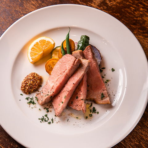 メインディッシュとして人気を集めるのが、旬の食材を使ったお肉料理。豚肩ロースのグリルや鴨のローストなど、その時々のベストな食材を使い、素材本来の旨みを引き出した逸品です。彩り野菜を添えた見た目にも華やかな一皿は、ワインとの相性も抜群。シェアしながら楽しむのにもぴったりです。