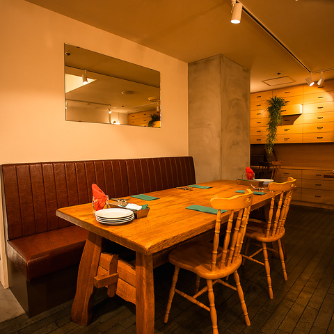 ソファ席はテーブル席と並ぶ形で配置されており、背もたれのある椅子でゆったりと座れるのが特徴。席の間隔が保たれており、2名~4名での利用に適しています。落ち着いた照明と木目調の床が調和し、会話を楽しみたい食事シーンにぴったりです。店全体のナチュラルな雰囲気に馴染む、リラックスしやすい空間です。