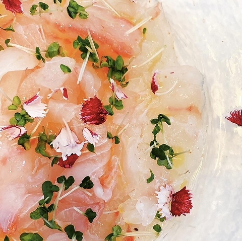 その日に仕入れた新鮮な鮮魚を、シェフが素材に合わせた味付けで丁寧に仕上げた一皿。爽やかな柑橘やハーブの香りがアクセントとなり、魚の旨みを引き立てます。彩り豊かな見た目も華やかで、前菜としてもワインのお供としてもおすすめです。