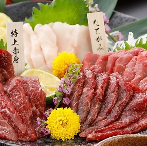 本場熊本から直送の馬刺しです。メジャーな赤身や霜降りの他レバーやタン、フタエゴなど珍しい部位も取り揃えております。