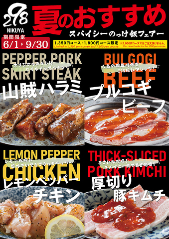 6/1~9/末まで期間限定季節のおすすめメニュー新登場!1480円焼肉食べ放題コースと1980円焼肉食べ放題コースに仲間入り☆※全て税込