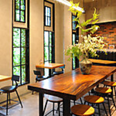【お洒落で静かなテーブル席】コンクリート打ちっぱなしの壁と温かい木のテーブルが調和したカフェ風空間。窓の外に映る緑の景色が、女子会やデートの雰囲気を盛り上げます。本格的な四川料理を、静かで居心地の良いお洒落な空間でゆっくりとお楽しみください♪2名席ございます!