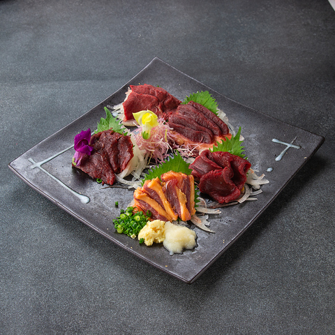 鮮度が命の馬刺しを、熊本から直送でご提供!赤身の旨味、霜降りのとろける脂、たてがみの甘み…部位ごとの魅力を味わえる盛り合わせはお酒との相性も抜群です!!こだわりの馬肉は低温管理のまま仕入れ、食感と風味を損なわずにご提供。にんにくや生姜醤油で味わえば、その旨さに思わず笑顔がこぼれます♪
