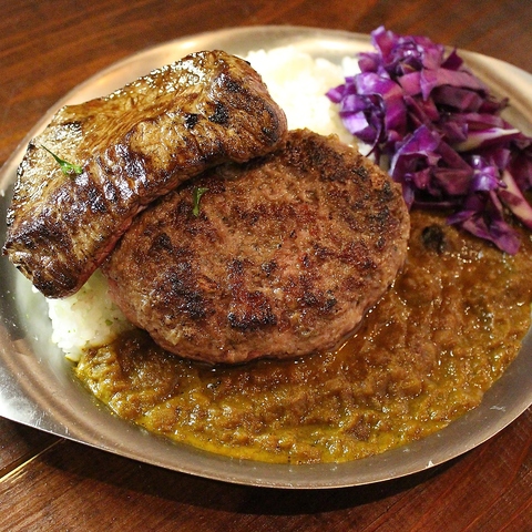 約20種類のハーブ&スパイスで仕上げた超本格派スパイスカレー! 和牛ステーキ&ハンバーグコンボトッピング!! 元々店主がこだわりのスパイスカレー屋さんを過去8店舗経営していた名残がここで味わえます^^