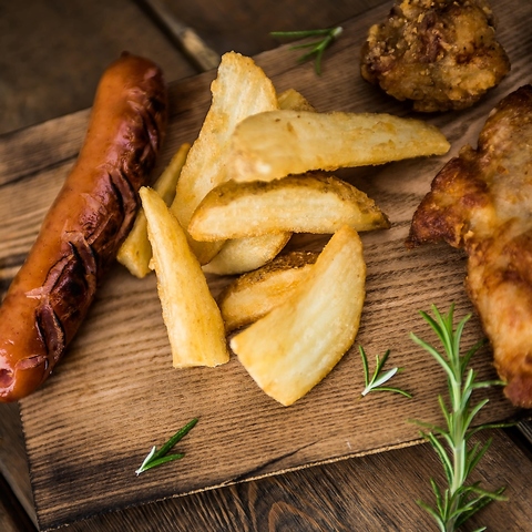 ソーセージ&肉屋のポテト&肉屋の唐揚げちょこっと3点盛り◎ おすすめです!!