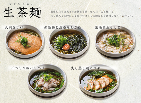宇治園×山長商店のコラボメニュー!宇治抹茶を練り込んだうどんに看板焙じ茶、火男を使ったあっさりとしたお出汁を使用しています♪ランチタイムに是非ご賞味ください。