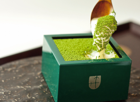 話題の升で提供される宇治抹茶を贅沢に使ったティラミス。濃厚な味わいをお楽しみください。