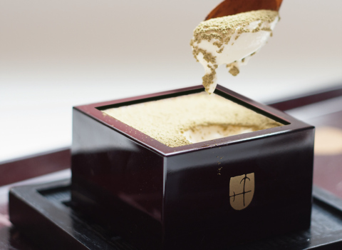 話題の升で提供されるほうじ茶「火男」の粉を使ったティラミス。香ばしいさっぱりとした味わいをお楽しみください。