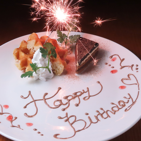 大切な誕生日に!華やかな花火と心温まるメッセージで、記憶に残るサプライズを演出します。濃厚なチョコケーキとサクサクのワッフルに、生クリームを添えた贅沢な盛り合わせ。主役の笑顔がこぼれること間違いなしの特製プレートです。お名前入れなどのご相談も承ります。特別な日の締めくくりにぜひ!