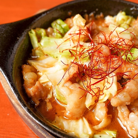 秘伝の濃厚なホルモンダレを鉄板で豪快に!ジュワッと焼かれたホルモンはぷりぷりの肉質と溶け出した甘い脂でお酒がとまらない逸品。一度ご賞味いただきたい当店名物です。