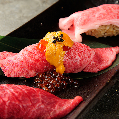 肉本来の旨みがじんわり広がり、ほどよい甘みと柔らかさとろける赤身肉の旨み、ウニの濃厚な甘さ、イクラの弾ける香り、キャビアのコク深い塩味が重なり合い、豪華さ贅を尽くした極上コラボ、そして濃厚なバラ肉寿司。一皿で三つの贅沢が味わえる、肉寿司好きにはたまらない“究極の三種盛り”です。