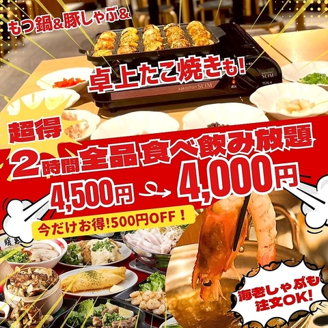 《500円OFF》2h全品食べ飲み放題4,500円→4,000円!もつ鍋&豚しゃぶ・たこ焼き食べ放題&飲み放題