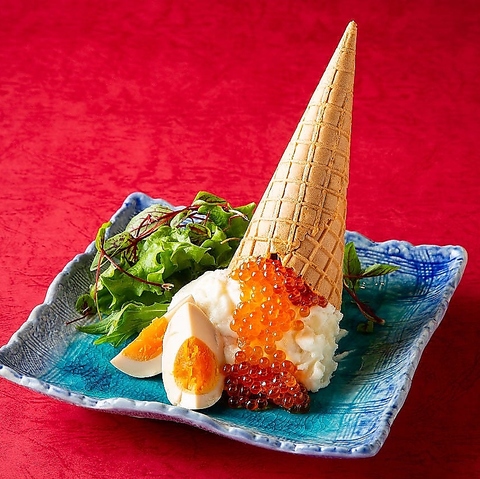 写真映え抜群の「ポテトサラダ」は、見た目も食感も楽しいおすすめメニュー!ひっくり返したアイスのコーンがかわいい♪いくら&特製ソースで美味しさも◎ぜひお試しください!
