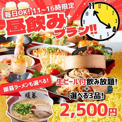 11:00~17:00のご来店限定で、選べる2つのワンコインハッピーアワー企画を開催中!500円で「1時間飲み放題」or「1時間当店自慢の手作り餃子&ライス食べ放題」のいずれかをお楽しみいただけます♪昼飲みにぴったり◎おかげさまで大人気の企画となっておりますので、早い時間のご利用がオススメです!
