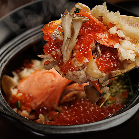日本の伝統食『白米』を、土鍋で炊きふっくらもちもちに仕上がった御飯は絶品の一言。注文を受けてから作り始め、炊き立ての最も美味しい状態でお出しいたします。鮭・いくら・金目鯛など多彩な食材と一緒に炊き上げます。一緒に炊く食材によって変わる土鍋御飯は、何度食べても飽きない当店自慢の逸品です。