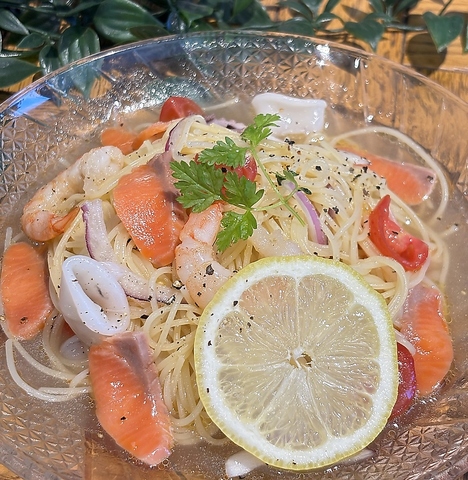 ジューシーなケイジャンチキンバーガーと貝出汁ソースの魚介冷製パスタの2種をご用意しております!