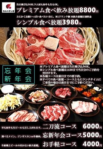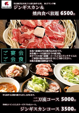 本格的なジンギスカンと和牛焼肉がお楽しみいただけるコース、食べ放題をご用意しました。生ビールがお飲みいただける飲み放題が付いたプランもございます。詳細はコースメニュー、クーポンページをご確認くださいませ。また当店は、コース等と組み合わせることなくアラカルトとご一緒に飲み放題だけをご注文いただけます。