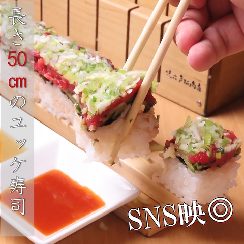当店自慢の【ユッケ寿司】は、全長約50センチというビッグサイズで、SNS映え間違いなし!友人同士でシェアして楽しむのにピッタリ♪メニューは3種類から選べ、アボカドクリームチーズユッケ寿司や、ユッケ寿司&アボカドクリームチーズユッケ寿司などの組み合わせも◎見た目と美味しさのいいとこどりをぜひお試しください☆