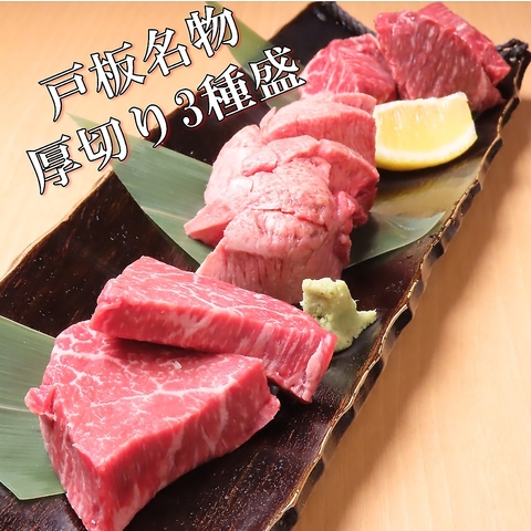 【戸板の定番3種厚(タン・サガリ・もも】は、分厚く切り出した極上の3種のお肉を贅沢に一皿に盛りつけた豪華で食べ応えのある逸品!これぞ焼肉!といった焼肉の醍醐味が存分に味わえます♪鮮度と品質にこだわった肉ながら、コスパが良いのも魅力です♪部位の組み合わせで、異なる3種盛も◎絶品ダレと一緒にお試しください☆