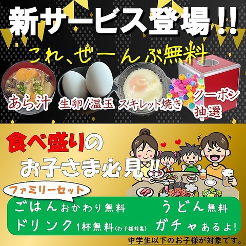 中学生以下のお子様が対象!!あら汁、たまご1人一個無料!食べ盛りのお子様応援します!!!
