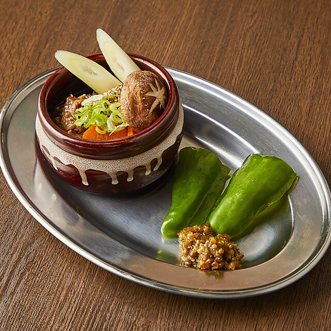 氷でキンキンに冷やした魔法の生ピーマンに、秘伝のタレに漬け込んだ焼肉を乗せて食べるのが金肉屋スタイル◎パリッとした食感と肉汁のハーモニーが絶妙です♪魔法の冷やし生ピーマンは275円(税込)です◎
