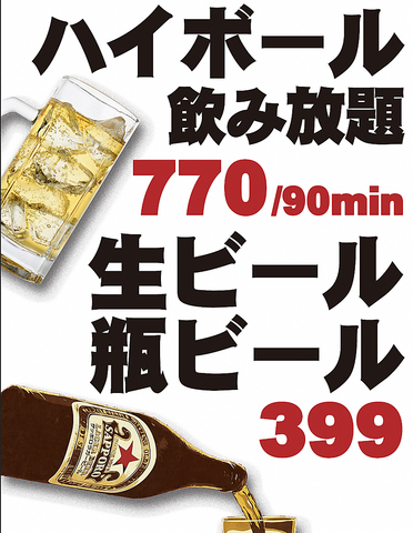 ハイボール飲み放題90分770円(税抜)!焼肉とともにお好きな飲んじゃって!生も瓶も399円と破格