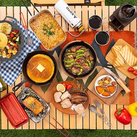 マルチグリドルやスキレット、メスティンなどを使った本格アウトドア料理も味わえます。
