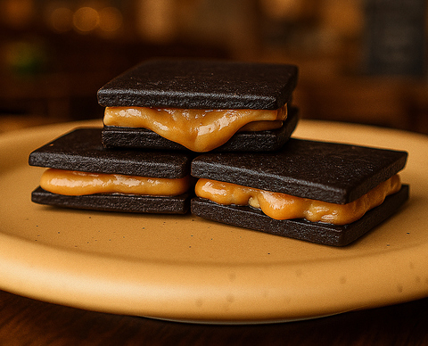 口溶けなめらかなキャラメルを香ばしいカカオクッキーでサンドしました。