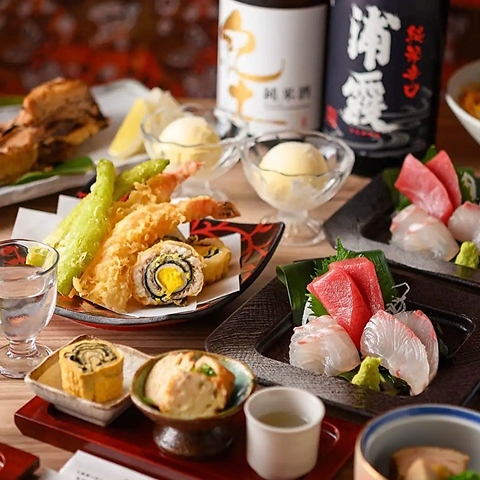 全席完全個室にてご用意。こだわりの和装空間にてごゆるりとお過ごしください。コースは全て3時間飲み放題にてご用意しており、金土祝前日の混雑時にも3時間にてご案内可能なコースもございます。拘り抜いた食材と、培ってきた技術を、十分なお時間にて存分にご堪能ください。お料理に合わせた銘柄酒もご用意しております。