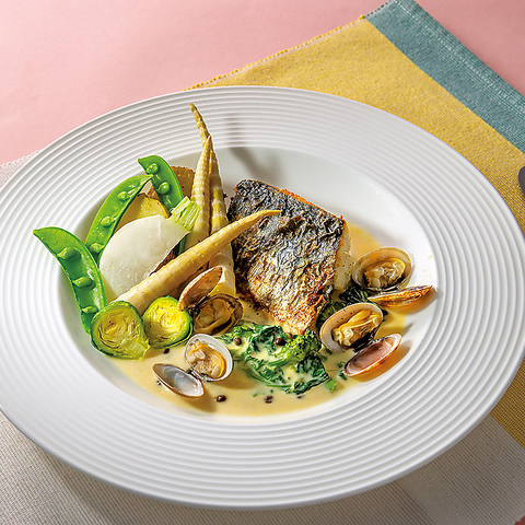 春の訪れを告げる魚「サワラ」を丁寧にムニエルにしました。アサリや菜の花など春の食材に、爽やかに香る山椒がアクセントのクリームソースを合わせた、季節感あふれる贅沢な一皿です。