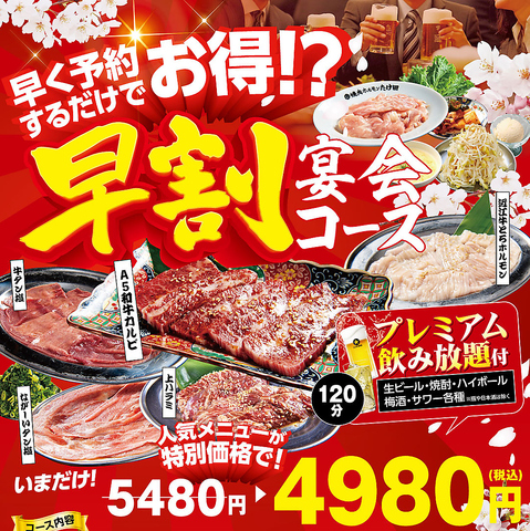 予約が早いだけで料理も価格も、勝ち確です!・A5和牛カルビ・近江牛上とろホルモン・極旨上ハラミねぎ・なが~いタン塩ねぎ山添え・新アカミックスなどなど人気メニュー勢ぞろい!!さらにビールつきプレミアム飲み放題120分もついてます!