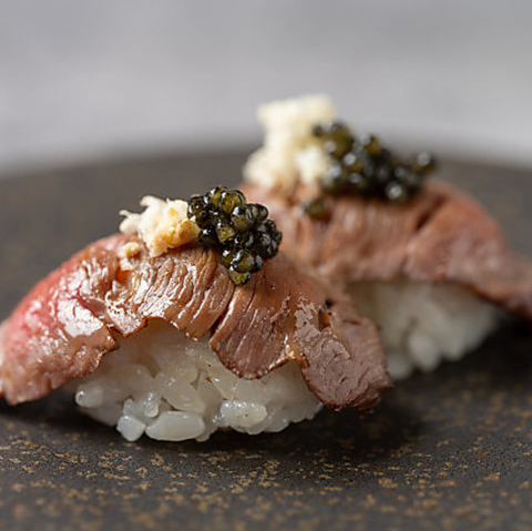 柔らかいランプ肉をタタキにしてお寿司にしました!仕上げに軽く炙ることで香ばしさと旨味が爆発します!キャビアトッピング 1200円